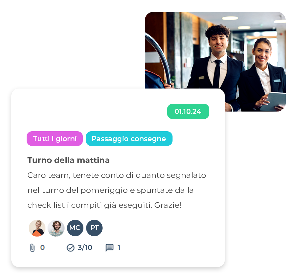Certamente! Impostiamo l’Hotelboard in base alle caratteristiche della tua struttura: reparti specifici, aree tematiche, gruppi di utenti e così via. La nostra piattaforma operativa per hotel sarà a immagine e somiglianza del tuo team.