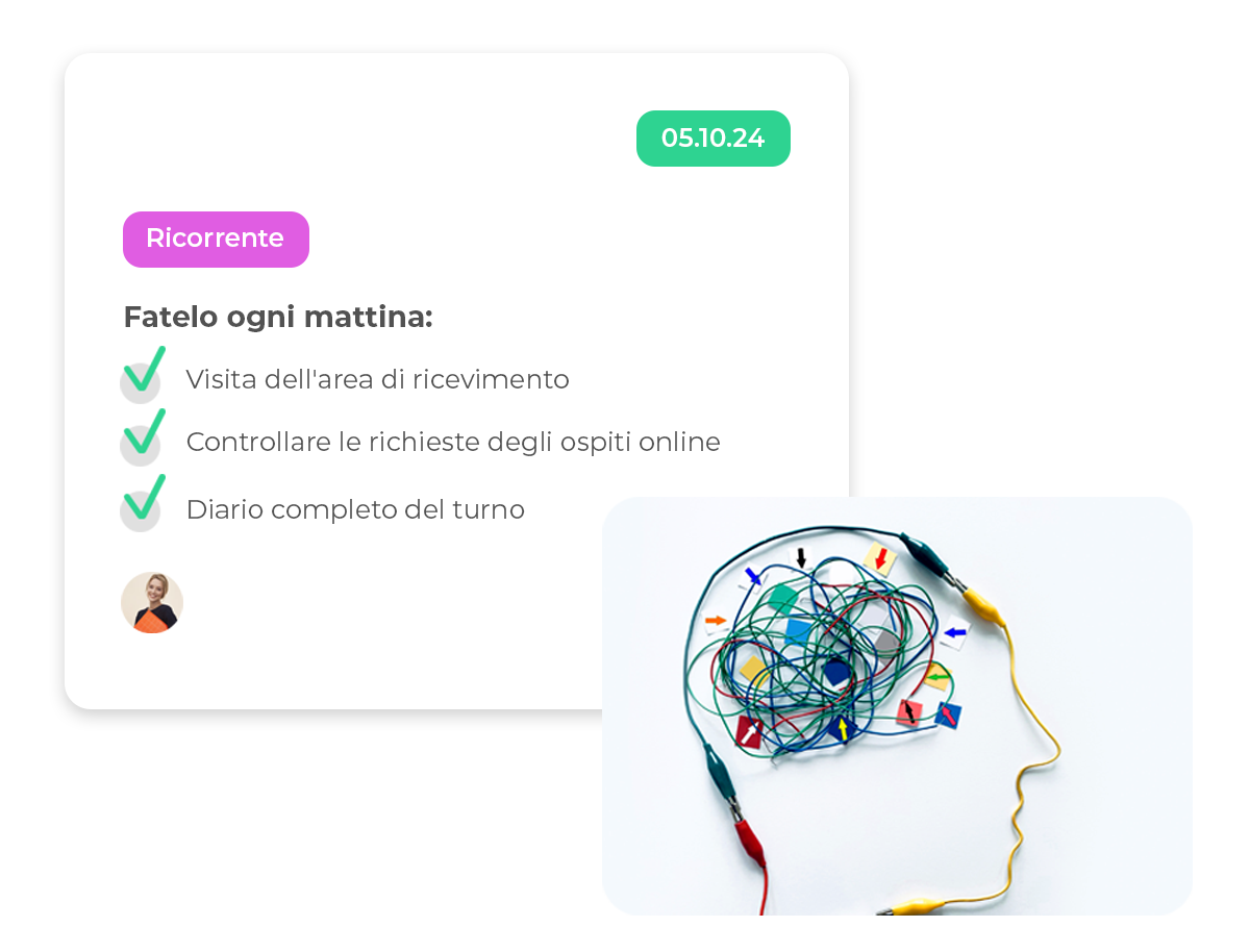 Mai più sovraccarico mentale sul posto di lavoro. Crei compiti ricorrenti che La ricordano automaticamente delle routine e delle attività regolari. Si evita lo stress mentale e i membri del team possono facilmente farsi carico dei compiti durante le malattie e le vacanze.