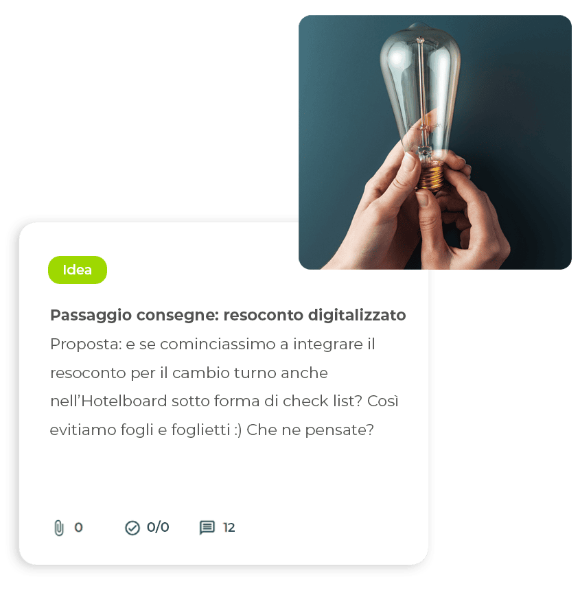 Vuoi motivare il tuo team a proporre nuove idee per ottimizzare la gestione e i flussi quotidiani? Con l’Hotelboard è facile. Offre uno spazio condiviso in cui il team può confrontarsi e sviluppare insieme soluzioni innovative. Per nuove proposte a beneficio dell’intera squadra!