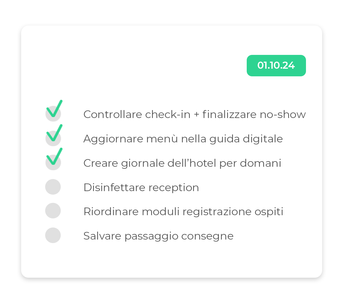 Con le check list dell’Hotelboard hai sempre una visuale aggiornata di cosa c’è ancora da fare e la certezza di non dimenticare nulla. Le check list sono anche un ottimo strumento per l’onboarding del nuovo personale.