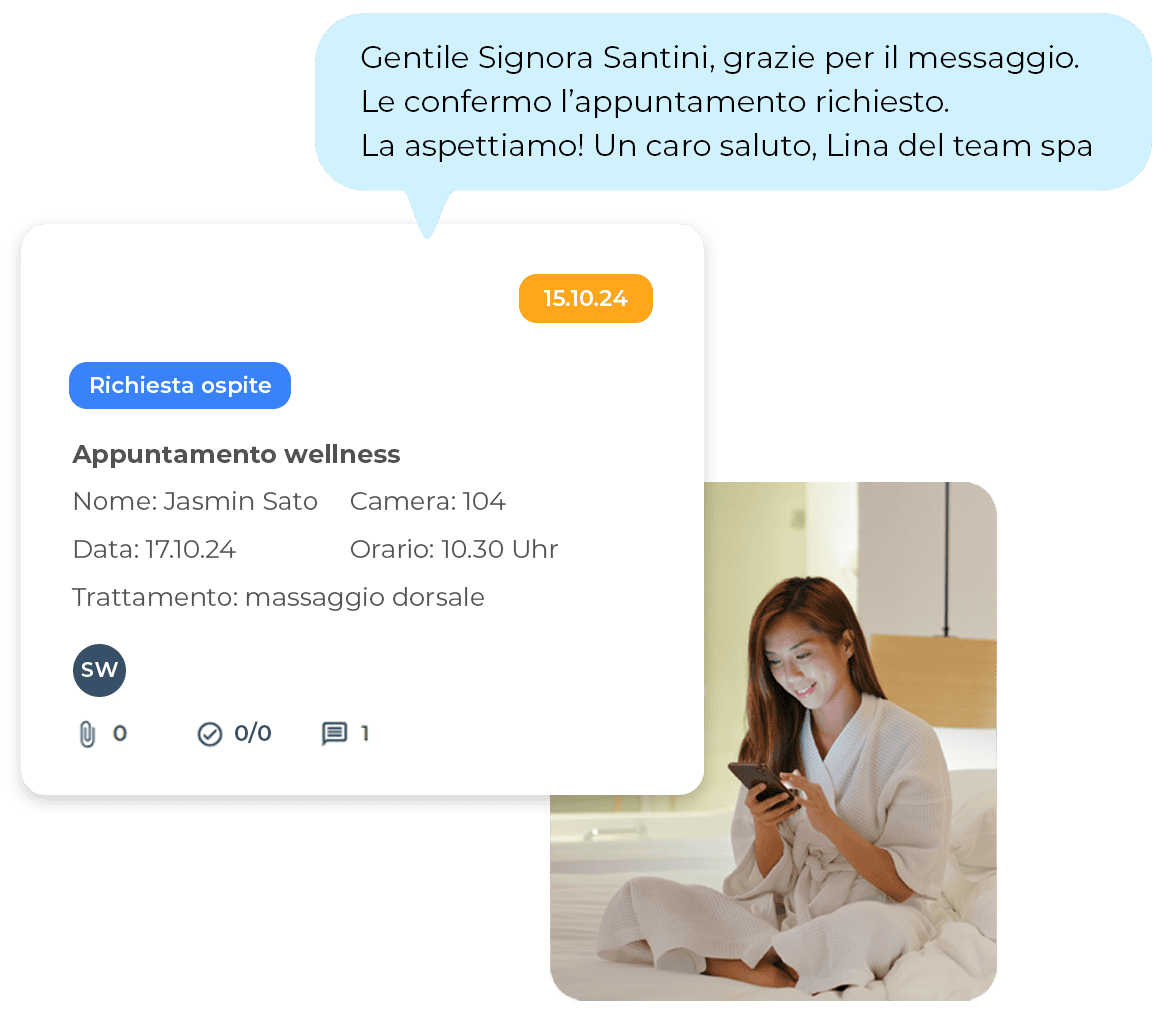 Tieni sempre tutto sotto controllo: coordina in modo efficiente tutti i reparti, gestisci le attività interne e rispondi alle richieste degli ospiti in modo rapido e professionale – grazie al collegamento diretto con la Guida digitale per gli ospiti.
