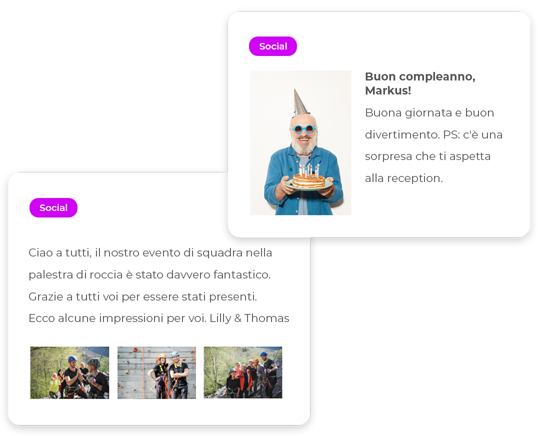 Crea uno spazio in cui il tuo team può condividere i successi professionali e i momenti più belli. Un feedback particolarmente positivo, un ottimo lavoro di squadra, un compleanno – brevi post sulla quotidianità in hotel fanno sentire più uniti e migliorano le relazioni sul posto di lavoro.