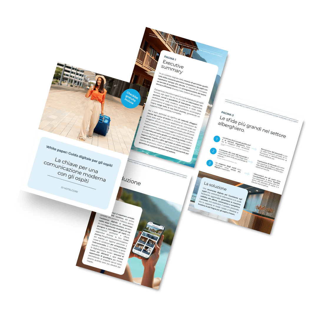 Sfrutta il nostro know-how consolidato per il tuo successo: Mettiamo a tua disposizione oltre 12 anni di esperienza nel settore ricettivo in modo chiaro, compatto e con checklist gratuite incluse. Scarica gratuitamente i nostri whitepaper e scopri come trasformare le sfide operative in opportunità di crescita, migliorando sia la soddisfazione degli ospiti sia la redditività del tuo business.